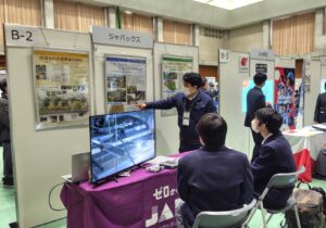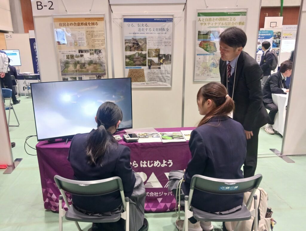当社は、建設コンサルタントの役割や業務内容について紹介するとともに、都市計画や公園設計、文化財調査など、社会や地域と関わりながら進める仕事の魅力をお伝えしました。説明では、専門技術に加え、関係者や地域住民との対話を通じて合意形成を図る「橋渡し役」としての役割を、事例やパース図、3Dデータを交えて紹介しました。また、マイクロドローンを用いた調査技術についても、実機を持ってもらい、映像を通じて説明しました。